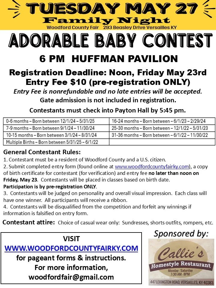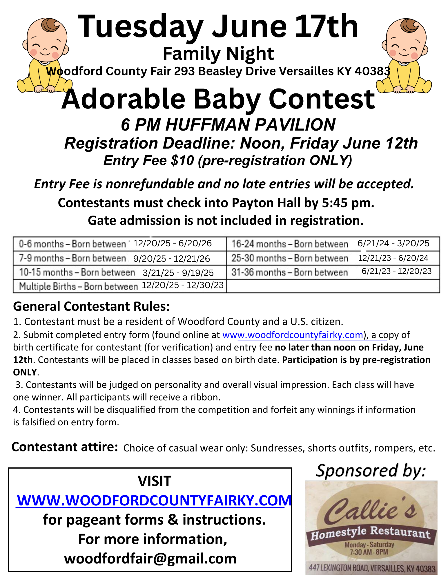Pageant Procedure: Baby contestant and parent will sit in the audience until the age groups are called. One parent will bring the baby on stage. Pageant score sheets will not be available to anyone. Decision of the judges is final.